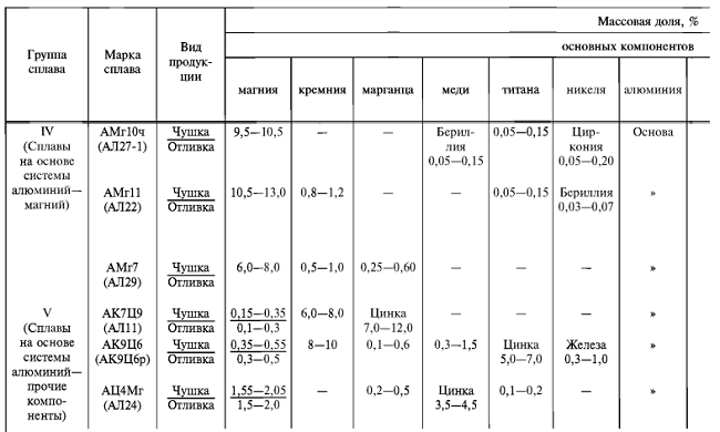 Алюминиевый литейный сплав регулируется ГОСТ 1583-93, который применяется к сплаву из слитков, используемому в качестве наполнителя для металла, а готовый литейный сплав (всего 39 марок) в соответствии с ГОСТ 1583-93 при маркировке сплава используется комбинированное (двойное) обозначение: во-первых, марка сплава указывается в слитке, указывается в скобках, например: АМГ7 (АЛ29).
