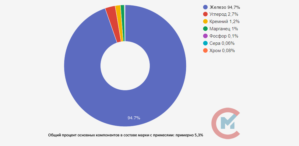 Особенностью состава является пониженное содержание углерода, от 2,4 до 2,7 %. Следующие по процентному соотношению элементы – кремний и марганец, они необходимы для улучшения литейных и прочностных качеств соответственно. Фосфор, сера и хром также необходимы для повышения различных характеристик чугуна, но их содержание в сплаве гораздо меньше.
